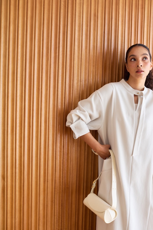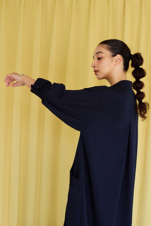 お腹周りにゆとりを持たせつつ肩や首が華奢に見えるよう、美しい曲線を描くコクーンシルエットに仕上げています。