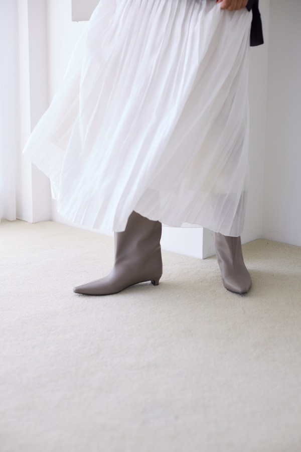 ボトムスの裾に隠れたときの見え方まで計算されたフォルム。つま先は、足元にシャープさを添えるポインテッドトゥに仕上げています。