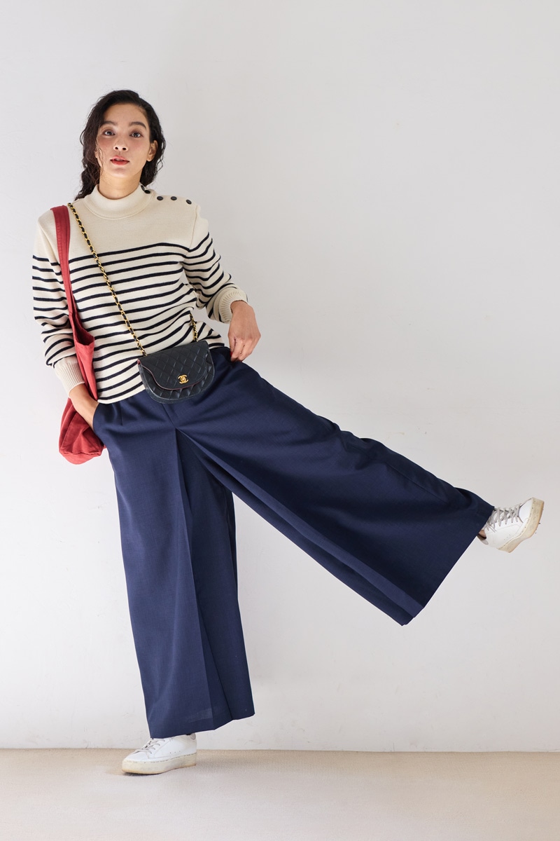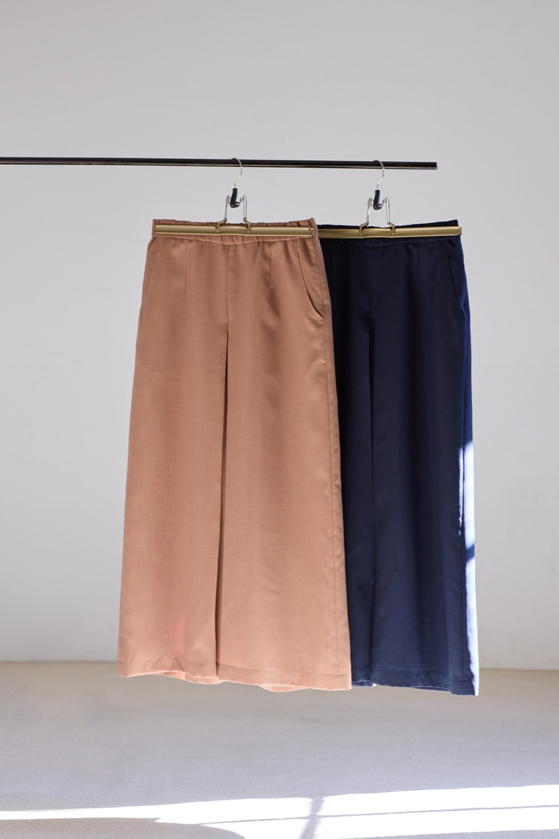 スカート感覚ではけるフレアシルエットが特徴です。ウエストの全面にギャザーを入れることで、締め付けのない快適なはき心地も実現。さらにウエストに2本のダーツを入れることで、もたつきのない腰回りに。お腹周りが目立ちにくいのがポイントです。