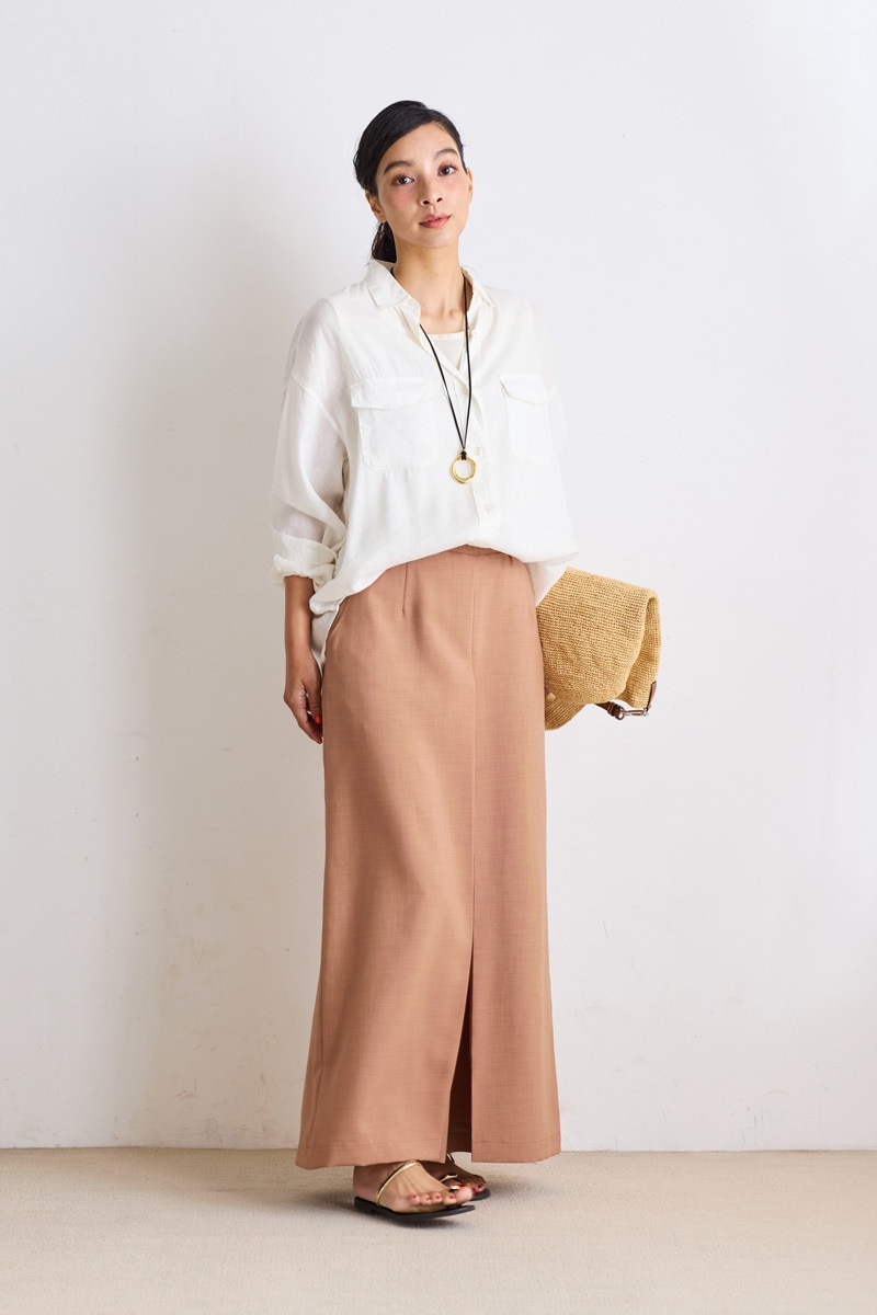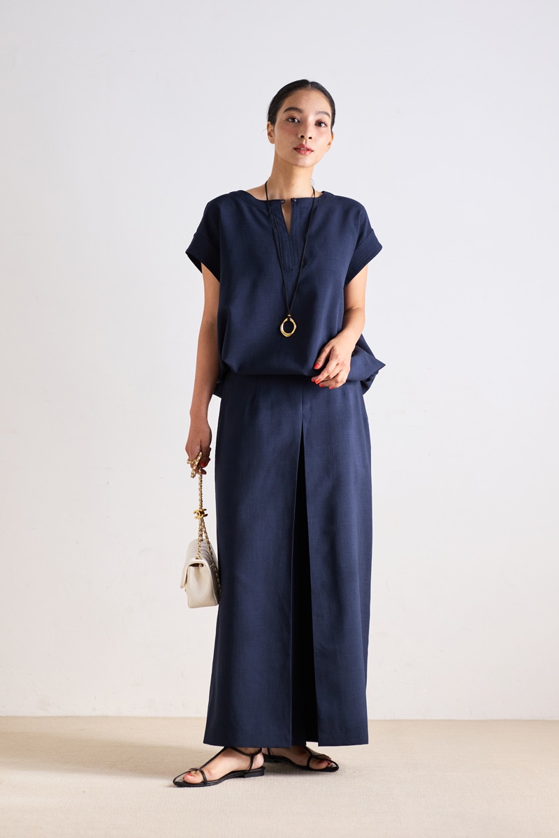 ボーダーのカットソーなどの夏らしいトップスと相性が良い他に、同生地を使ったブラウスともセットアップで着用可能。