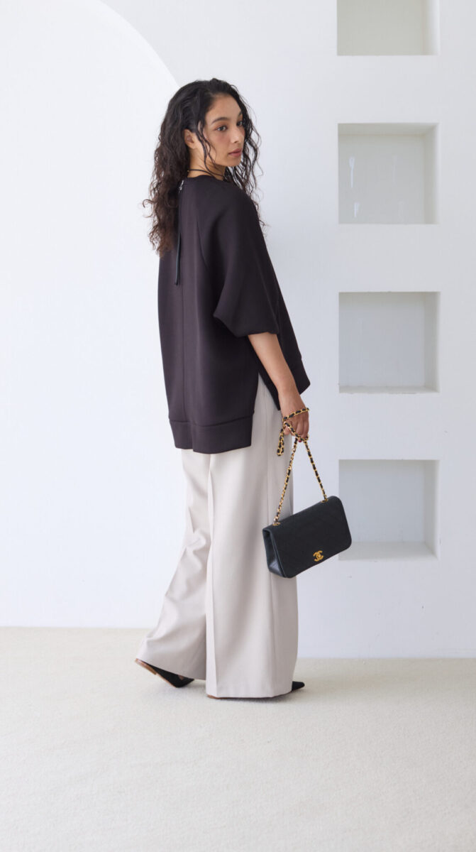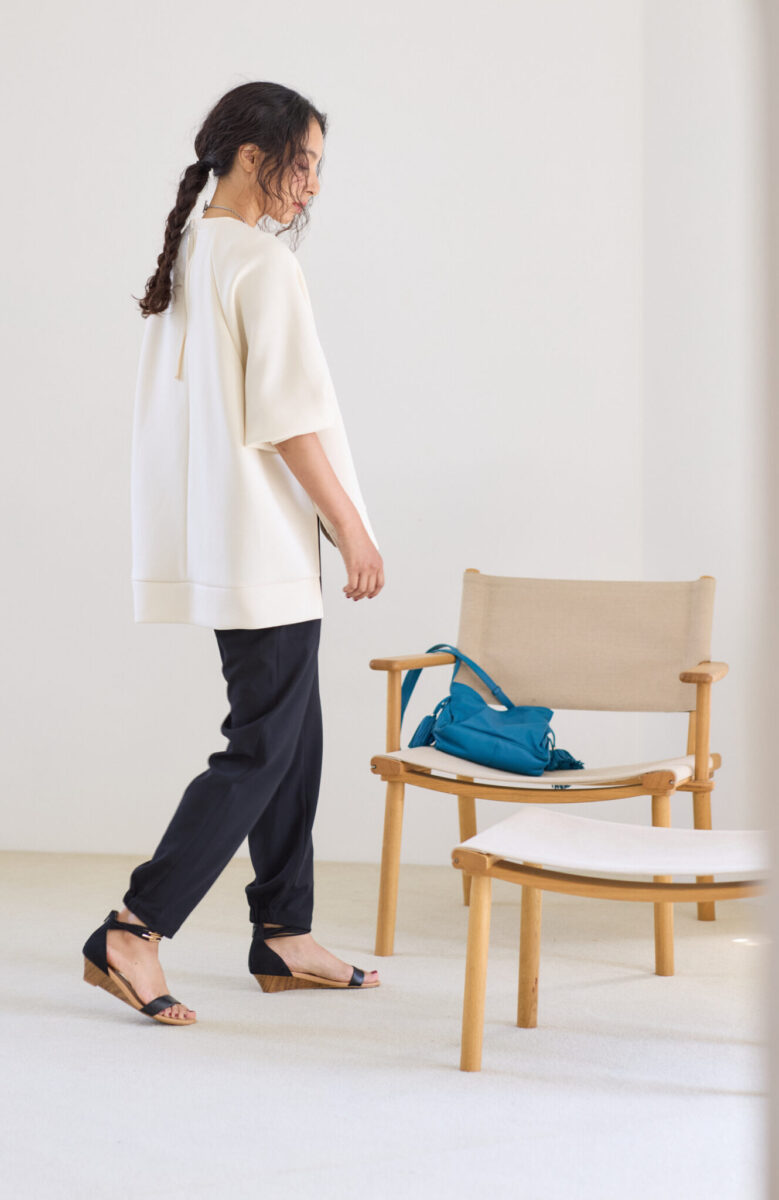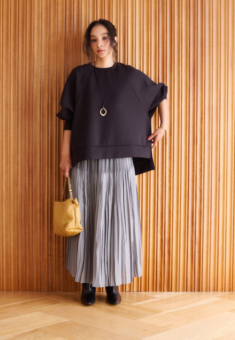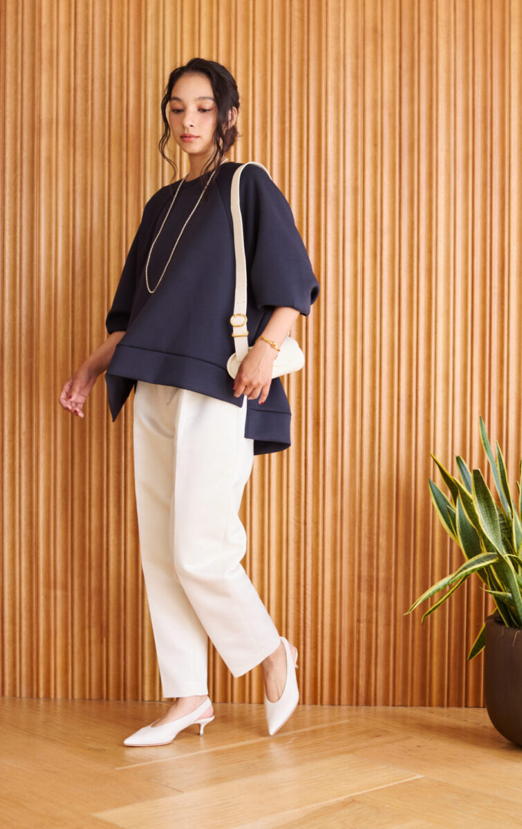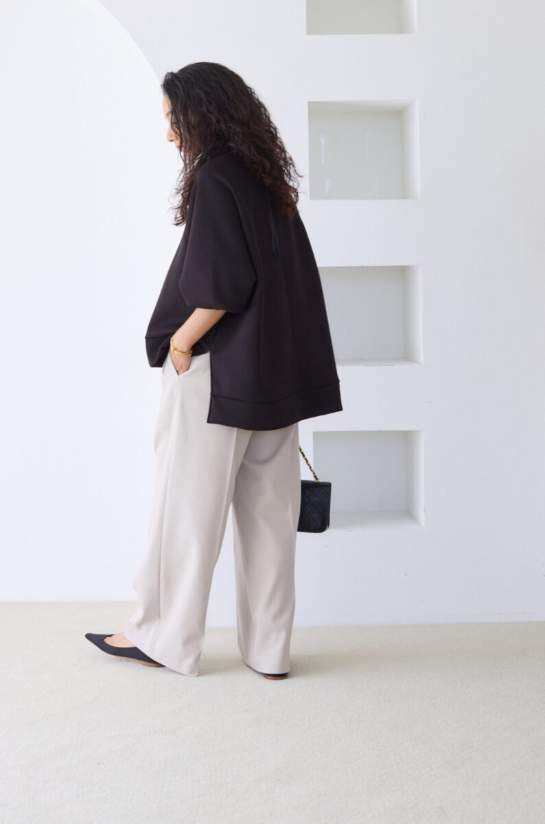 前後に程よい差をつけているので、スカートでもパンツでも自然にバランスがとれて、ボトムス選びに悩まなくていいようにしました。(ほぼなんでも似合います)