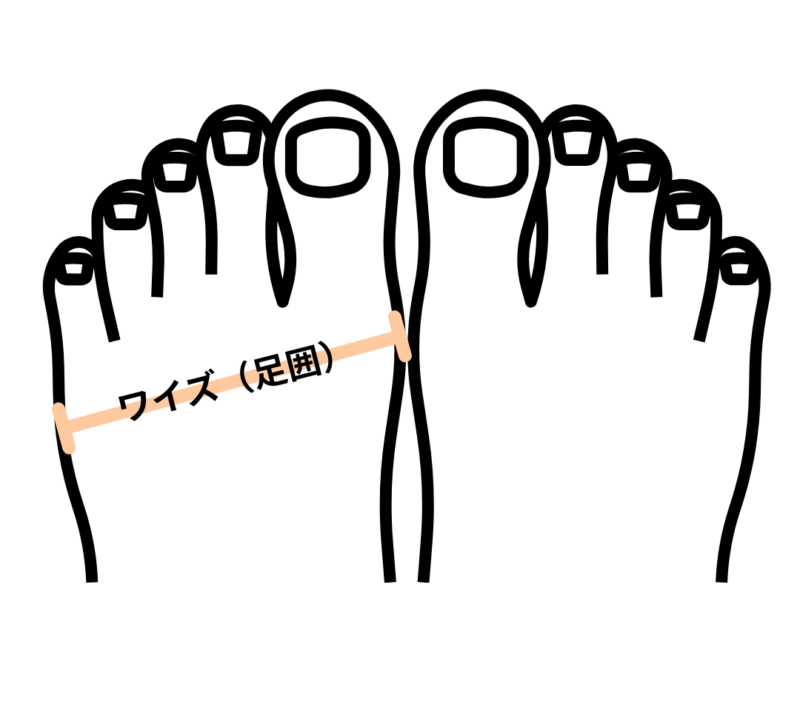 親指の関節の1番出ている部分と、小指の関節の1番出ている部分をメジャーで測ります。それが足囲です。
